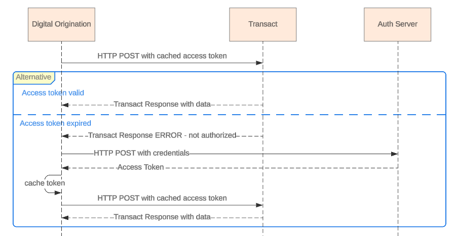 Before making any API call to Transact, Digital Origination must obtain an access token from the authorization server. Digital Origination passes the four data elements listed above to the authorization server to obtain the access token. It is not necessary to request a new access token for every API call, so Digital Origination caches the token to be used again and retrieves a new token only if the cached one fails.