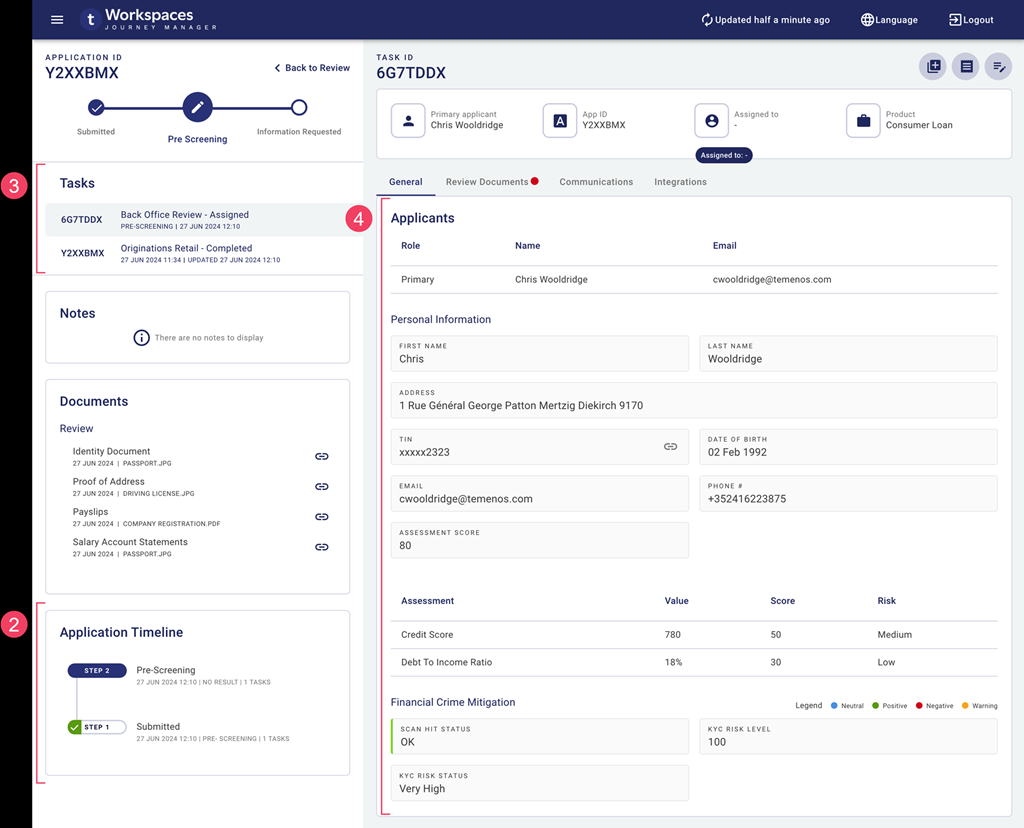 - Once the task has been claimed, review the Financial Crime Mitigation section to ensure the KYC checks have passed. This is a crucial step in verifying the identity of the applicant.