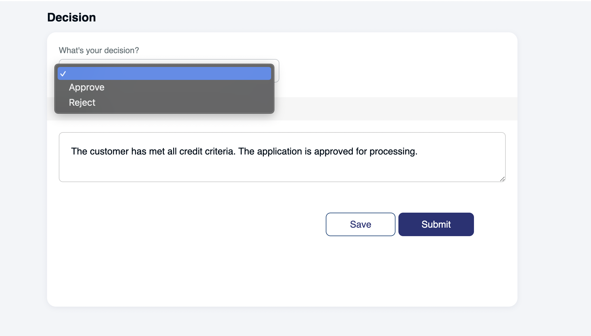 - After completing the credit review, click Decision to make a decision. Select the appropriate decision from the options provided. An email will be sent to the prospect detailing the outcome of the application and including the offer letter if applicable.