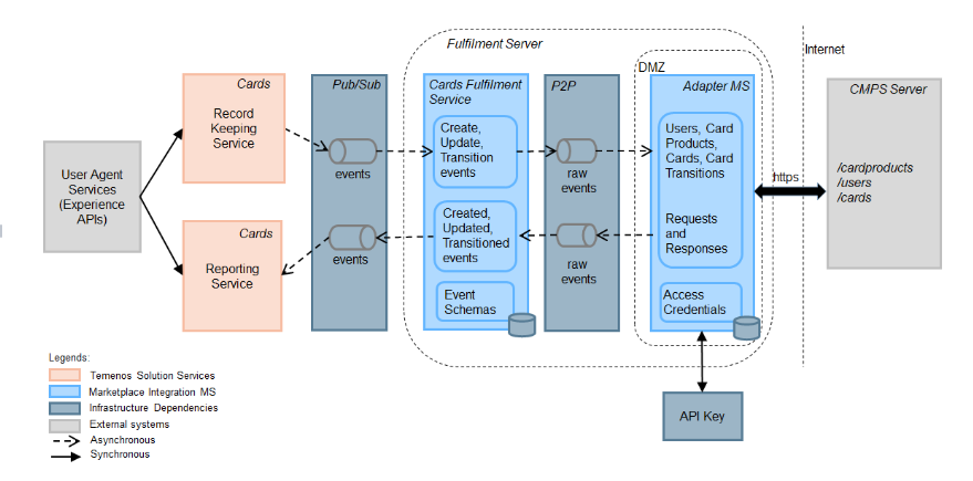 Below is a logical architecture view of the Cards Fulfilment Server core product with its depending services.