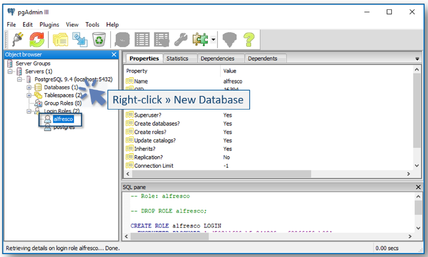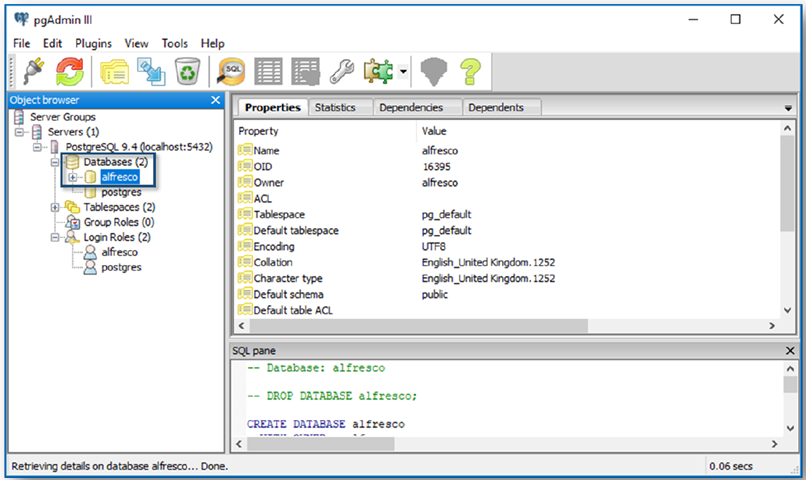 The following steps show you how to use the PostgreSQL pgAdmin III application to add a Database and User for use with Alfresco.