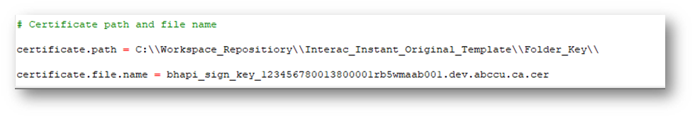 - False: The public key certificate path and filename are required to do internal verification. The certificate.path and certificate.file.name should be specified in the property file. Sample values are shown below.