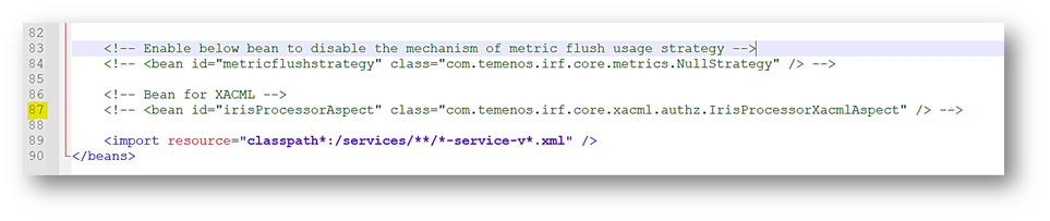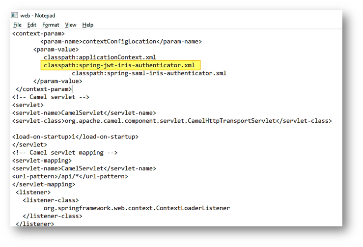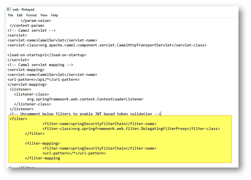 - Enable Spring security filter. IRIS web application gets enabled with Spring security filter chains by configuring respective tags in the web.xml of IRIS application. Uncomment the below springSecurityFilterChain. By default, this is disabled.