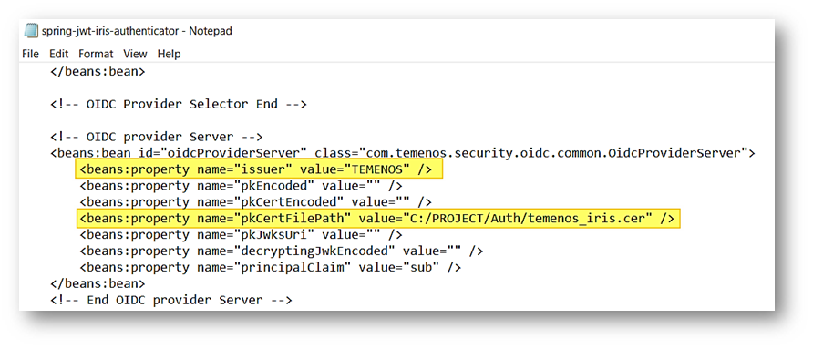 - In the in spring-jwt-iris-authenticator file, Issuer refers to value in 'iss' in the generated JWT token and pkCertFilePath refers to the public key certificate path in the local directory.
