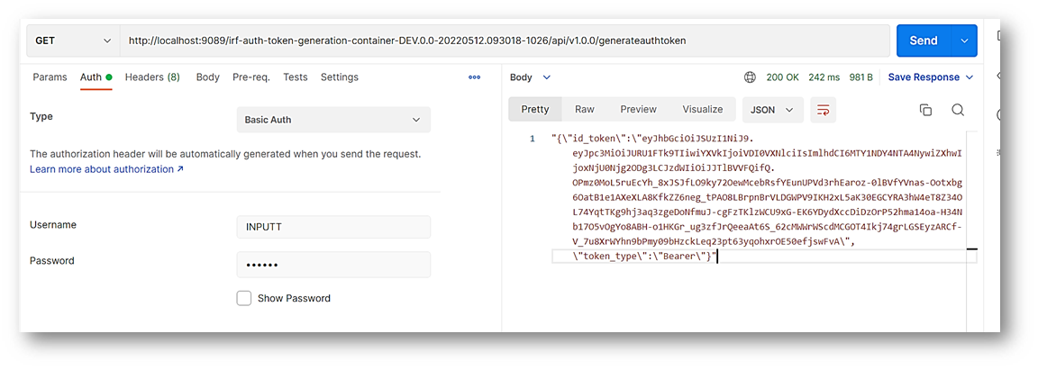 - Use the GET method to generate security token in Postman. The URL for the GET method is: http://localhost:9089/irf-auth-token-generation-container-DEV.0.0-20220512.093018-1026/api/v1.0.0/generateauthtoken