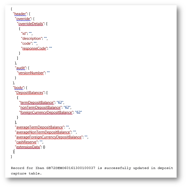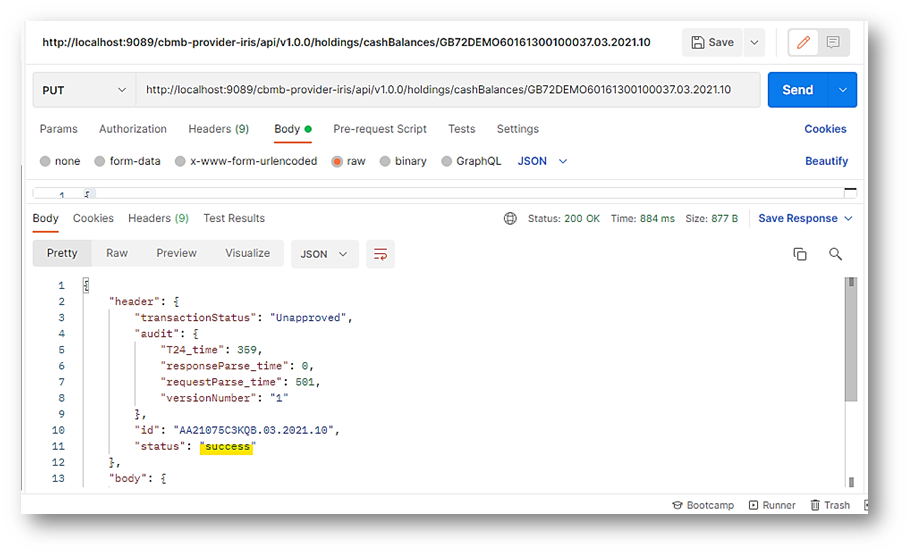 - Update the cash balance in deposit capture by using the PUT method. The URL for the PUT method is: http://localhost:9089/cbmb-provider-iris/api/v1.0.0/holdings/cashBalances/GB72DEMO60161300100037.03.2021.10