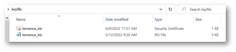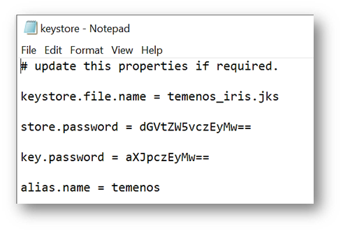 temenos_iris.jks is the key store file and the properties are mentioned in keystore.properties file.