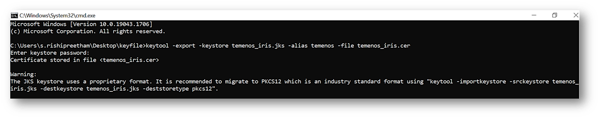 keytool -export -keystore temenos_iris.jks -alias temenos -file temenos_iris.cer