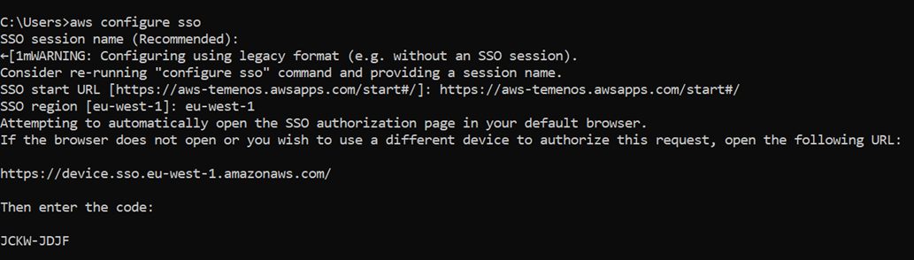 - Configure AWS CLI to authenticate user to use aws. Here, you would require a sso-start-url and sso-region provided by the AWS admin: aws configure sso.