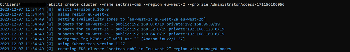 - Create an AKS cluster using the eksctl tool: eksctl create cluster --name <cluster name> --region <region> --profile <profile>