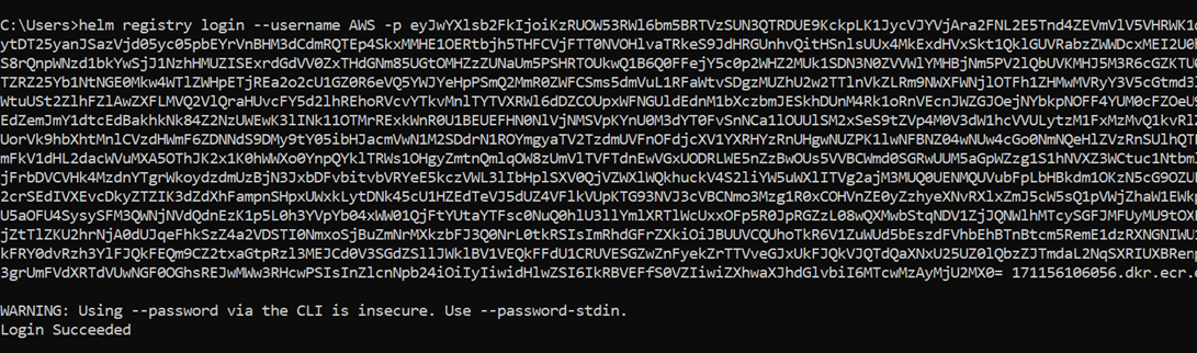 - Authenticate Helm to connect to the ECR registry: helm registry login --username AWS -p (password generated with get-login-password) 171156106056.dkr.ecr.eu-west-2.amazonaws.com/sectras:dev