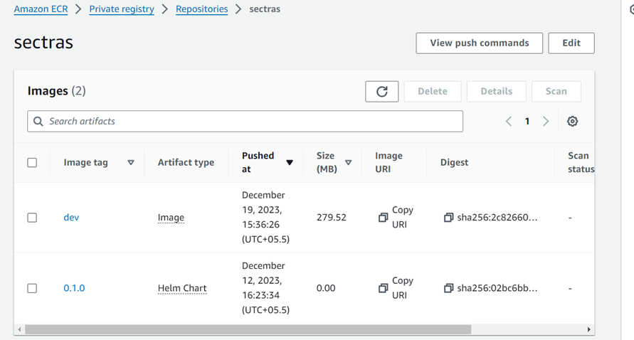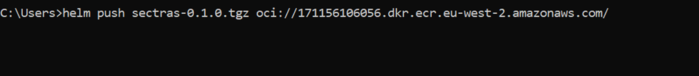 - Push the charts to the registry: helm push sectras-0.1.0.tgz oci://171156106056.dkr.ecr.eu-west-2.amazonaws.com/