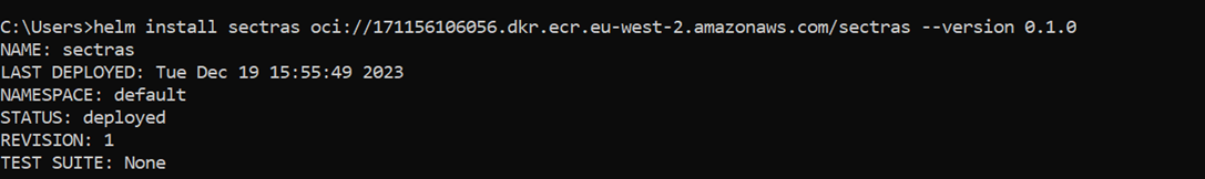 - Install the helm charts: helm install sectras oci://171156106056.dkr.ecr.eu-west-2.amazonaws.com/sectras --version 0.1.0