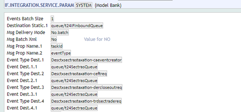 The event queues must be configured in the IF.INTEGRATION.SERVICE.PARAM>SYSTEM record. A sample configuration is given below.
