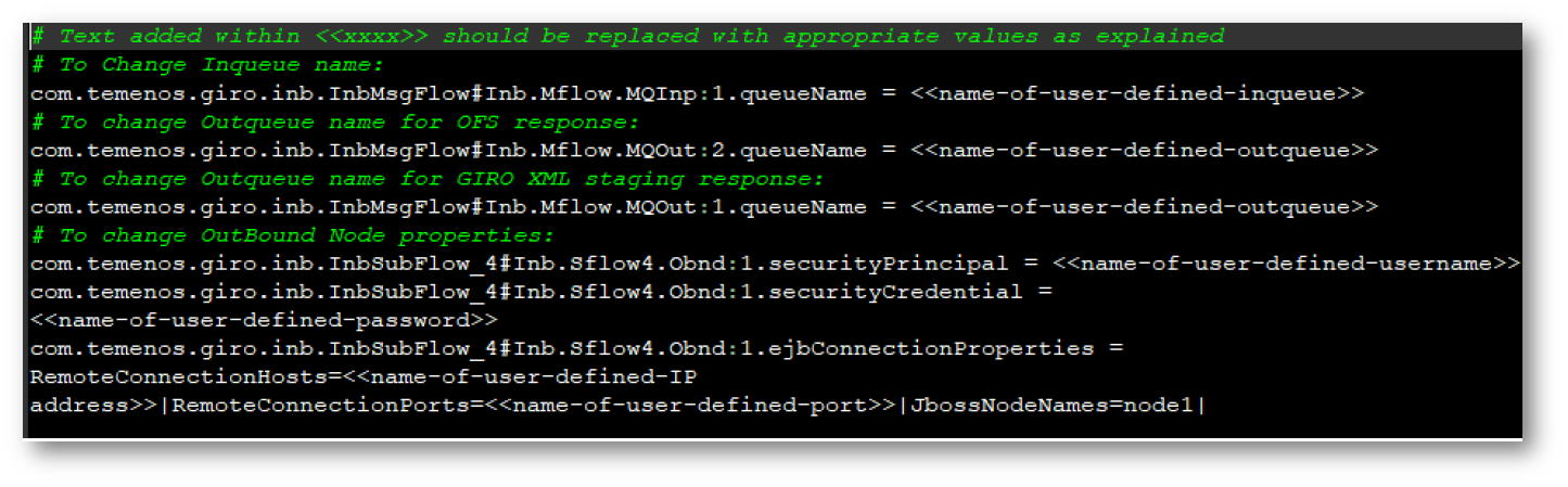 - mqsiapplybaroverride -b "<<location-of-bar-file>>" -k GIRO _Inbound -m “com.temenos.giro.inb.InbSubFlow_5#Inb.Sflow5.MQOut:1.queueName= <<name-of-user-defined-outqueue>>”