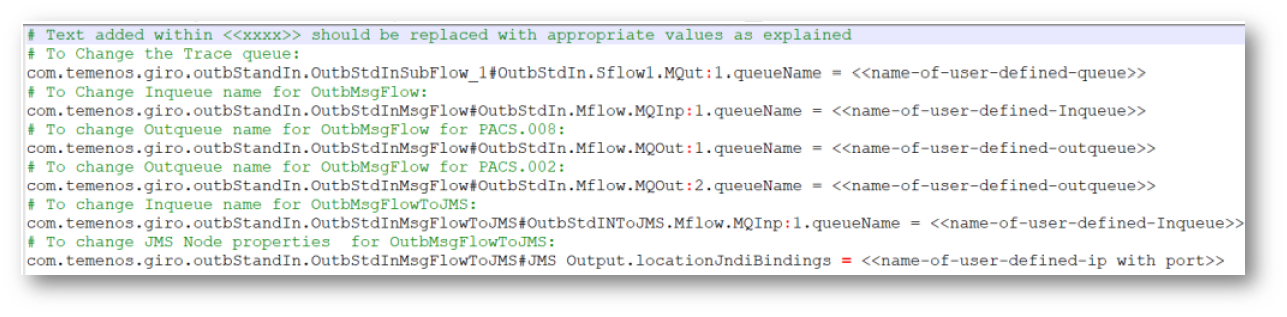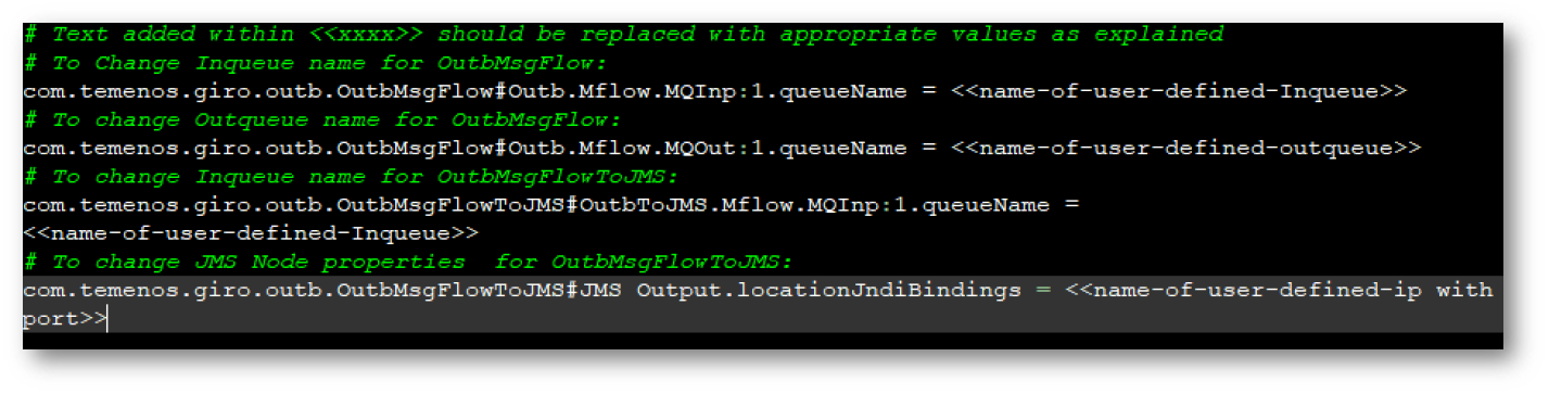 - mqsiapplybaroverride -b "<<location-of-bar-file>>" -k GIRO _Outbound -m “com.temenos.giro.outb.OutbSubFlow_1#Outb.Sflow1.MQut:1.queueName= <<name-of-user-defined-outqueue>>”