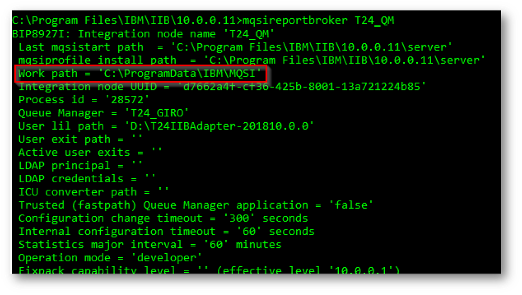 - The Log4j, JPTM and PPINST_InstantOutwardXML JAR files has to be placed at IIB WORKPATH which can be know through the below command in IIB console: mqsireportbroker <<broker-name>>.
