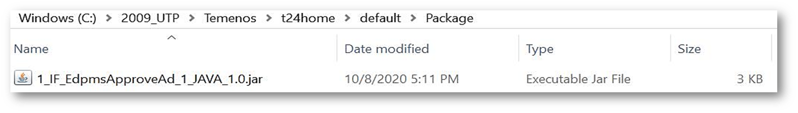 - Place the 1_IF_EdpmsRequestAd_1_JAVA_1.0.jar in the ..\Temenos\t24home\default\Package existing package folder.