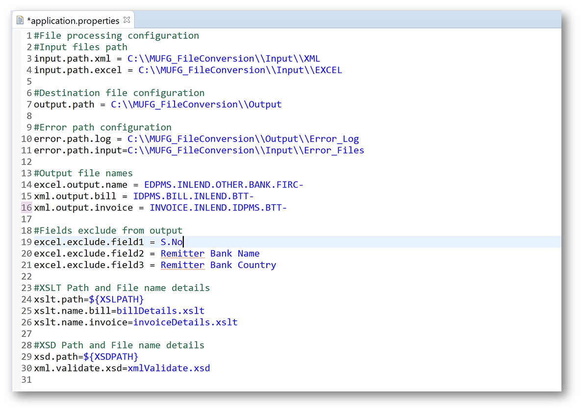 - In the Root path of the extracted package, change the application.properties as required.The input.path and error.log.path shouldn’t be the same. Do not change the xslt.path and xsd.path here.