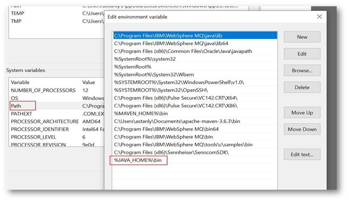 - Add the %JAVA_HOME%\bin in the path variable as per below.