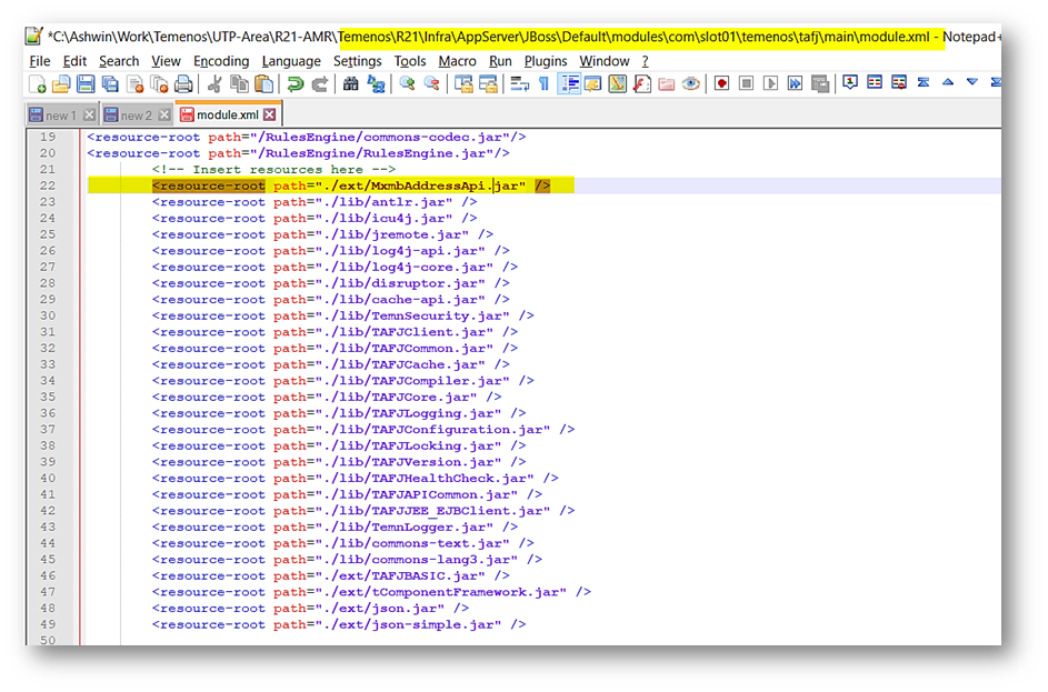 - Include this jar file name in the module.xml located in Temenos\UTP-Area\R21-AMR\Temenos\R21\Infra\AppServer\JBoss\Default\modules\com\slot01\temenos\tafj\main.