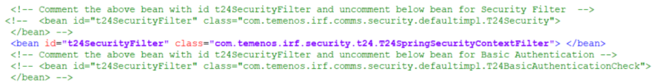 Enable the following bean in the applicationContext.xml file and disable all other ‘t24SecurityFilter’ files.