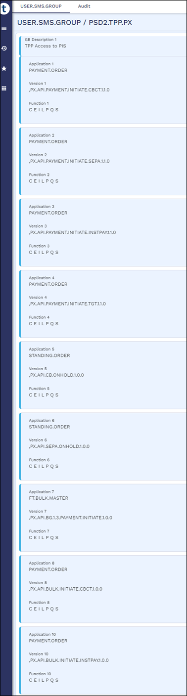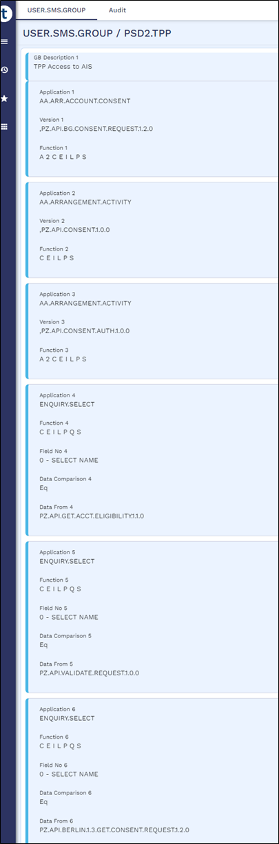 Below are the USER.SMS.GROUP profiles with all the versions, enquiries, applications and functions that are used for AIS, CBPII and PIS implementations. When the client introduces a local artefact which is to be accessed from the TPP/Gateway, it must be included in the respective profiles.