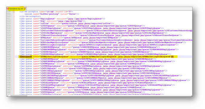 - To create the new JMS AFBMarketingOrderQueue queue add queue details in the Jboss Standalone file for the Security Master update.