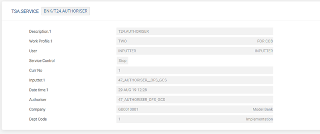 • To run the online service, you need to authorise the corresponding BATCH, TSA.SERVICE and PGM.FILE records of T24.AUTHORISE .