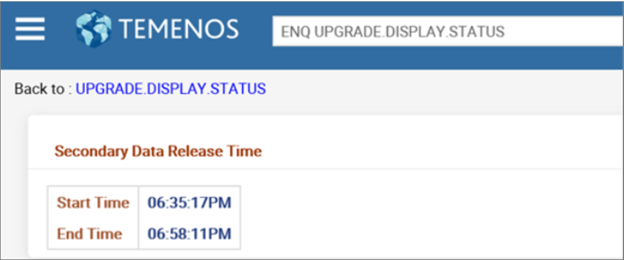 - Primary Data Release Status shows you the start and end time of the T24.UPGRADE.PRIMARY service.