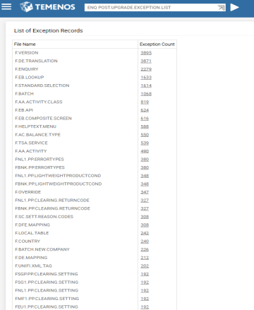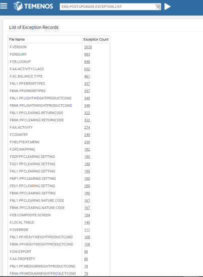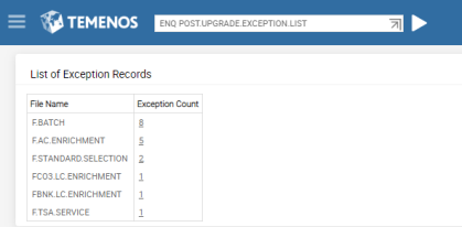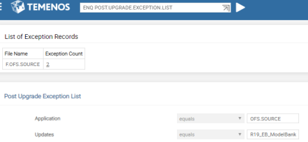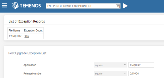 The POST.UPGRADE.EXCEPTION.LIST enquiry fetches all the data items released through online upgrade and module installation, without any selection criteria.