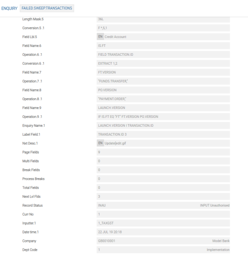 - Error details from OFS.REQUEST.DETAIL for authorisation-failed records, which are still in INAU.