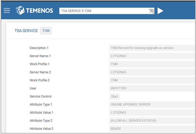- When there is no such setup in this attribute field of TSA.SERVICE in the TSM record, the Temenos Transact system automatically becomes online after primary data gets released. This is because the system launches all services in the production system and also in the online upgrade container. The T24.UPGRADE service also releases secondary (non-critical) data items in parallel when online channels are up and running.