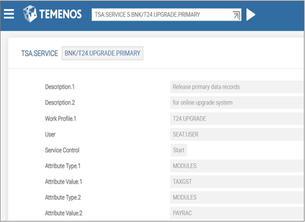 5. Commit the T24.UPGRADE.PRIMARY service to release the primary data of these Temenos Transact products.