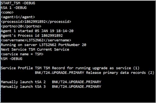 • After this step, the Temenos Transact system becomes online after a manual verification (if required). This allows all services in TSM to run in all active servers. One of them is T24.UPGRADE service, which continues to upgrade Temenos Transact system by releasing secondary data items (remaining data items from TEMP.RELEASE).