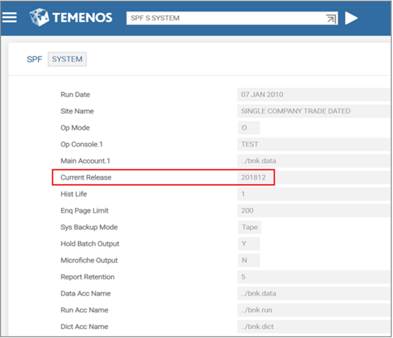 • You can see the updated SPF SYSTEM record with the Current Release field value as 201812 and Online Upgrade field value as PRIMARY.UPGRADE.COMPLETED. The cache reset period value is updated and moved to the Last Cache Reset Period field by T24.AUTHORISE service because once the Temenos Transact system becomes online, the re-connected sessions can reset cache only once per session and need not repeat cache reset every day.