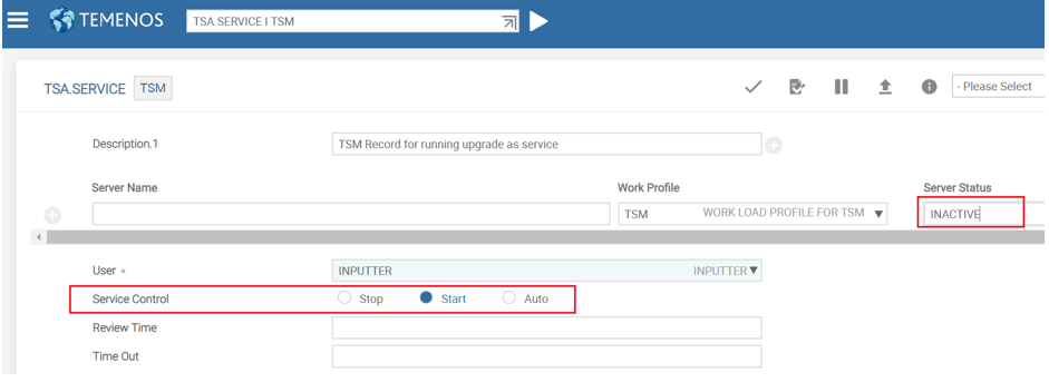 You should not shutdown TSM by changing the Service Control field value to Stop because TSM should be active in the online upgrade server.