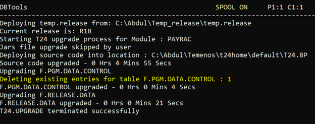 DBtools -u t24user -p Temenos_123 -cf DEVBRP.properties -log tmprelease.log TEMP-RELEASE C:\Abdul\Temp_release\temp.release skipT24LibDeployment -bp C:\Abdul\Temenos\t24home\default\T24.BP -module PAYRAC