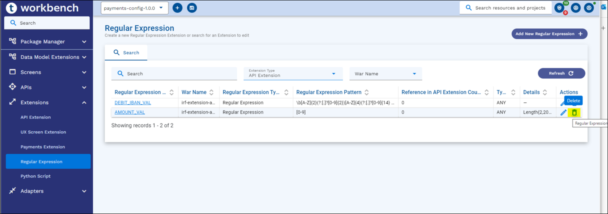 - Regular Expression delete is applicable for two extension types namely: API Extension and UX Resource Extension