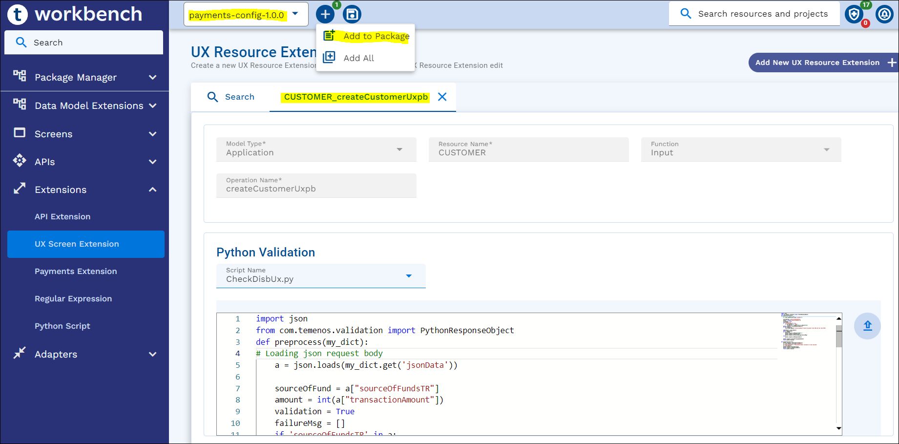- On the appbar, click the ‘+’ icon and click either Add to Package/Add to Project, or Add All to add UX Resource Extensions to the package or project.