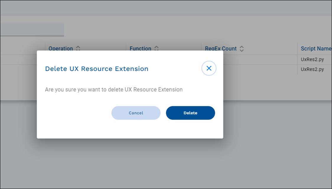 - In the Delete confirmation popup, click Delete. This deletes the UX resource extension from the config service.