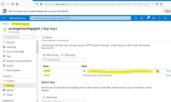 masterKeyToken rem command to get the master API token. call az rest --method post --uri "/subscriptions/%subscriptionid%/resourceGroups/%RESOURCE_GROUP_NAME%/providers/Microsoft.Web/sites/%APP_NAME%/host/default/listKeys?api-version=2018-11-01" | python -c "import json,sys;obj=json.load(sys.stdin); print(obj['masterKey'])" >> out.txt SET /p masterKeyToken=< out.txt