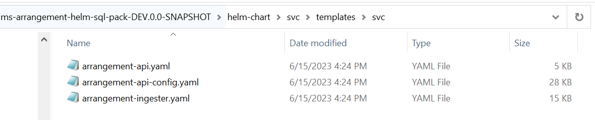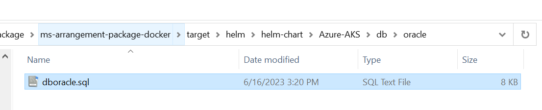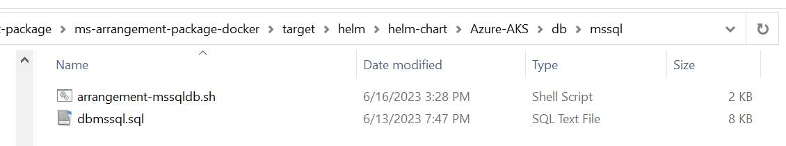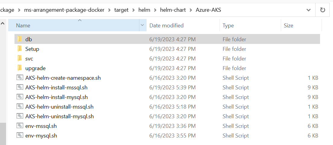 - Navigate to the ms-arrangement-helm-sql-pack-xxxx\helm-chart\Azure-AKS folder: