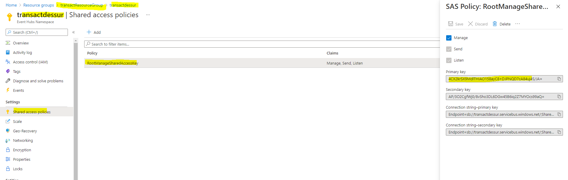 You can view the eventhub connecting to the created transactdessur.servicebus.windows.net:9093.