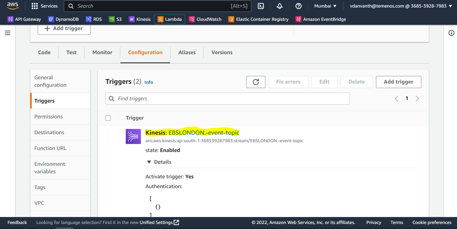 Event Processor Lambda function should be configured with the kinesis stream where the Transact business events are streamed from Transact System.
