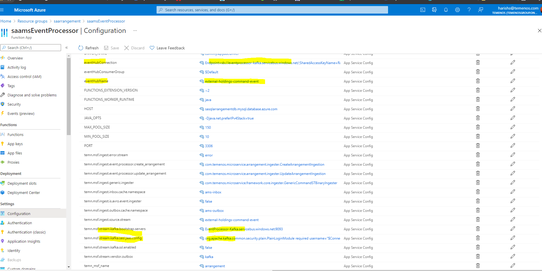 - temn.msf.stream.kafka.bootstrap.servers should point to the Event Store EventHub.