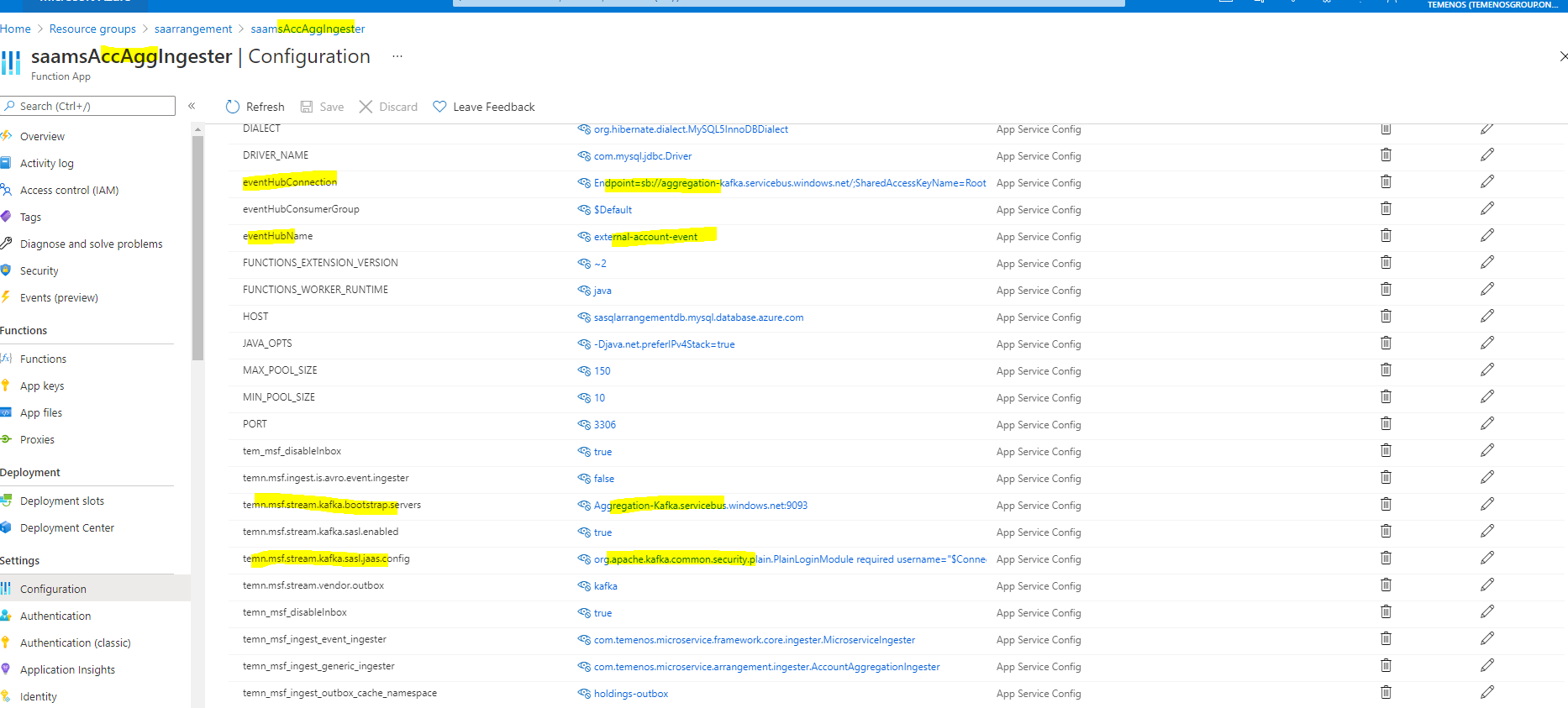Once AMS Azure is deployed under a particular Resource Group, you can check the configurations of the Event processor ingester of AMS functionApp. This is done as follows: