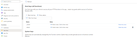 - Obtain the API key for each endpoint by using the func azure functionapp list-functions <function-app-name> --show-keys command. Alternatively, you can also obtain the API key from the Azure function GUI.