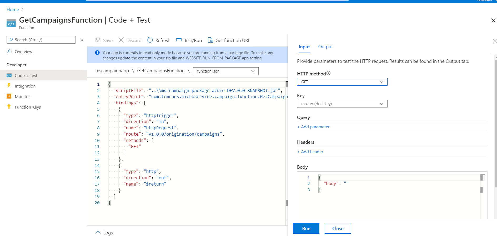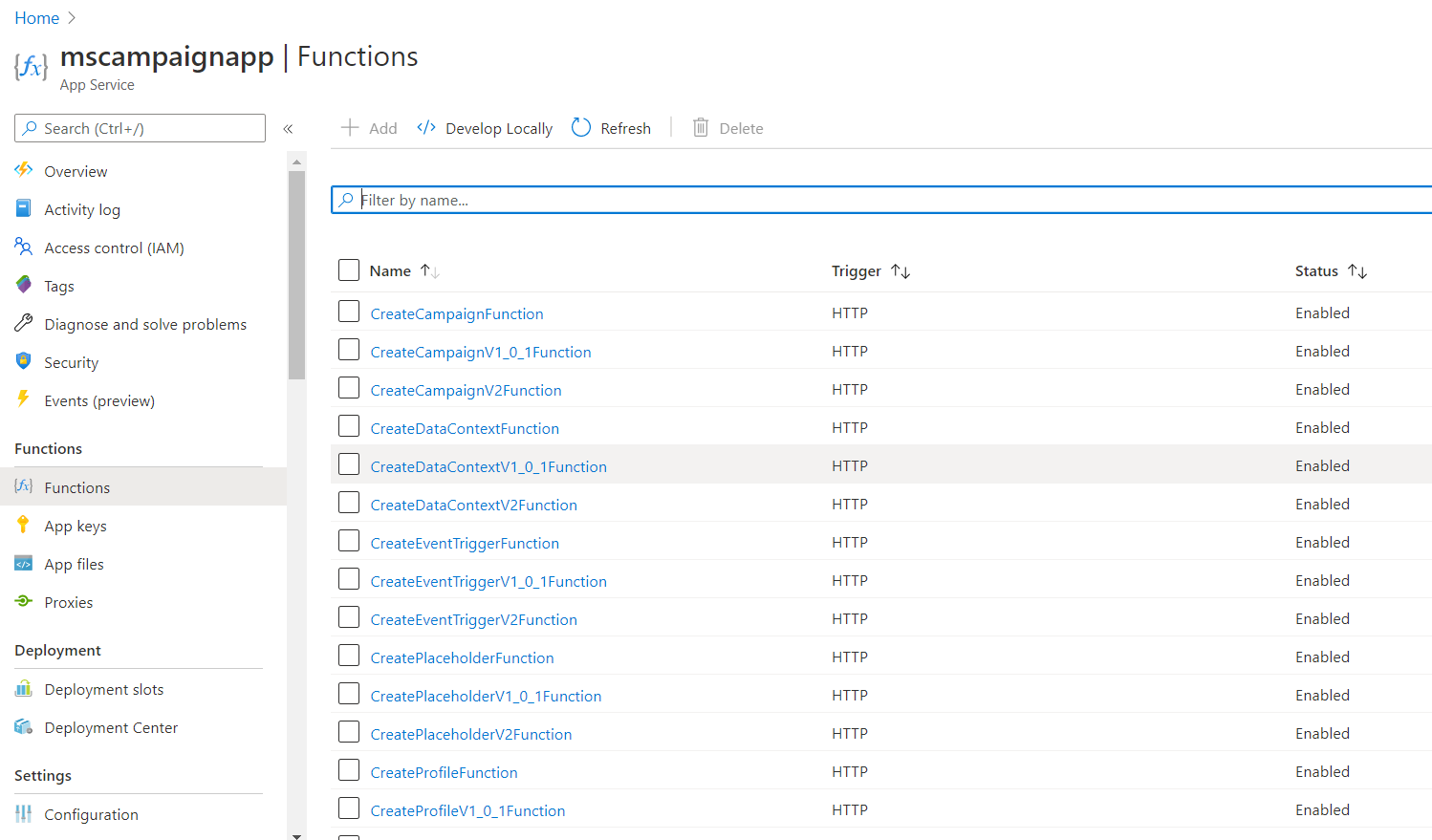 - The default Azure function app name in the script can be changed. In case of app name changes, the folder available (ms-campaign-api\target\azure-functions\<app folder>\) in the name of the app must also be renamed.