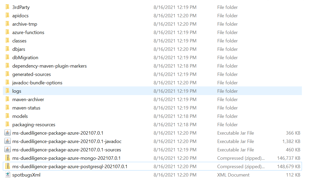 This section shows the folder structure of Due Diligence package. It is available as a single release bundle as, ms-duediligence-package-azure-mongo<release_number>.zip and ms-duediligence-package-azure-postgresql<release_number>.zip.